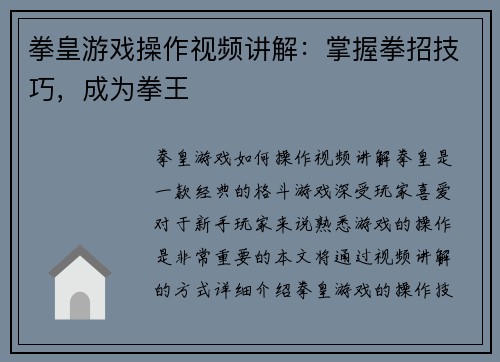 拳皇97手柄如何爆气 介绍 拳皇97是一款经典的格斗游戏,玩家可以通过手柄来控制角色进行战斗。爆气是游戏中非常重要的技能,可以增加攻击力和连击的可能性。本文将详细介绍拳皇97手柄如何爆气。 手柄的基本...